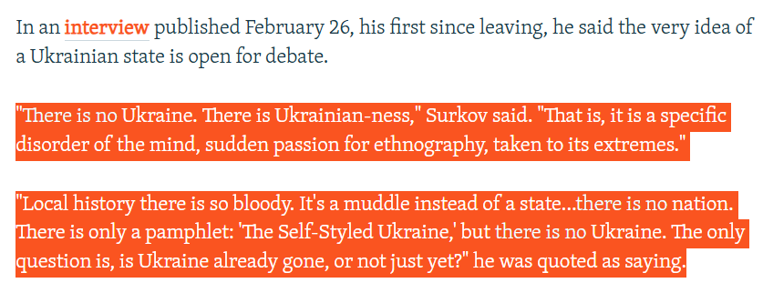 Vladislav Surkov, the former “grey cardinal” of Kremlin propaganda, said “there is no Ukraine, no Ukrainian-ness” in an interview: